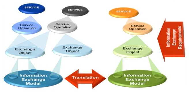 629. Technologies which perform automated translation between information models is not yet available to any greater extent. Therefore, the translation technologies described in Section F.2.3.5.6 focuses on supporting translation rules which are based on manual model mappings. F.2.3.3.4. Information Exchange Objects630. An information object is a set of data elements that are contained and treated as one unit. The content structure may vary in complexity from the simplest form with a number of data elements and an identifier to complex data structures and large quantities of data elements. Examples of information objects are documents, messages and data sets such as geographical data sets. 631. Information objects are created, processed, stored and moved/exchanged via services. An information exchange object is a standardised view, or an excerpt from, an information exchange model which from a technical point of view is suitable to exchange as a coherent set. Thus information exchange objects is a subset of all information objects which are meant to be exchanged via services. F.2.3.3.5. Services and the information aspect632. In a Service Oriented Architecture [Principle_5], information objects are created, processed, stored and moved/exchanged via services. Therefore it is important to understand the architectural relationship between services and information. I.e. how are services and information specified in order to enable the implementation of a service oriented architecture. 633. As depicted in Figure F.3, a service has operations. They are used for specification of how a consumer can interact with the service, for example create, read, update, delete. An operation requires one or more information objects to be exchanged between the consumer and provider, for example a message or a document. These exchange objects are excerpts from an information exchange model.